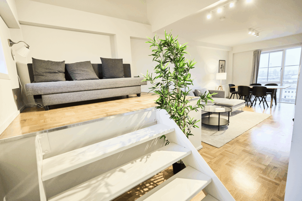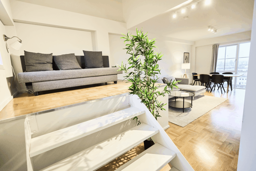With 150 square meters of space and a large balcony, our apartment is perfect for relaxation and entertainment. The three bedrooms downstairs provide comfortable sleeping arrangements, while upstairs, the spacious living room, kitchen, and sofa bed offer flexibility for larger groups.